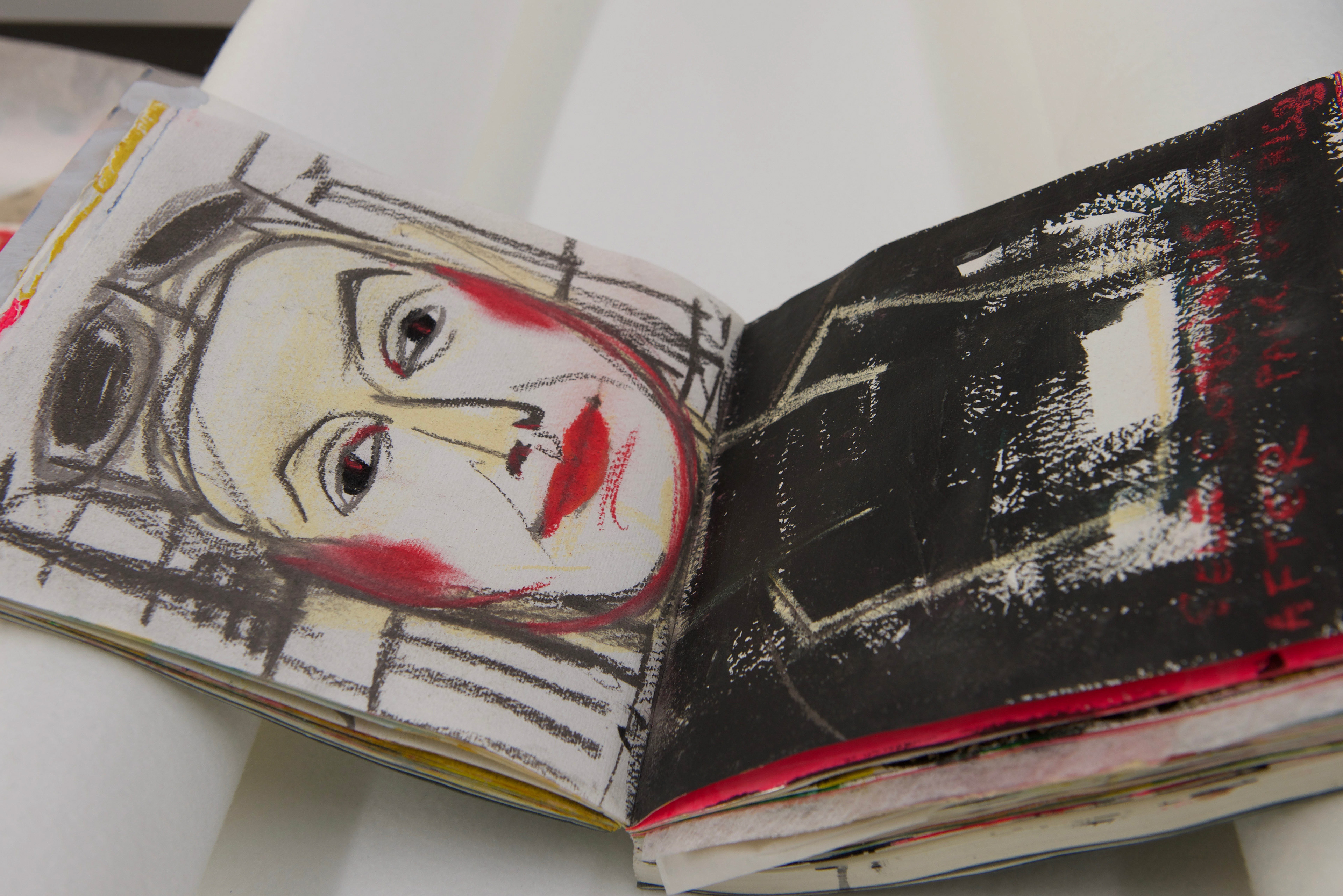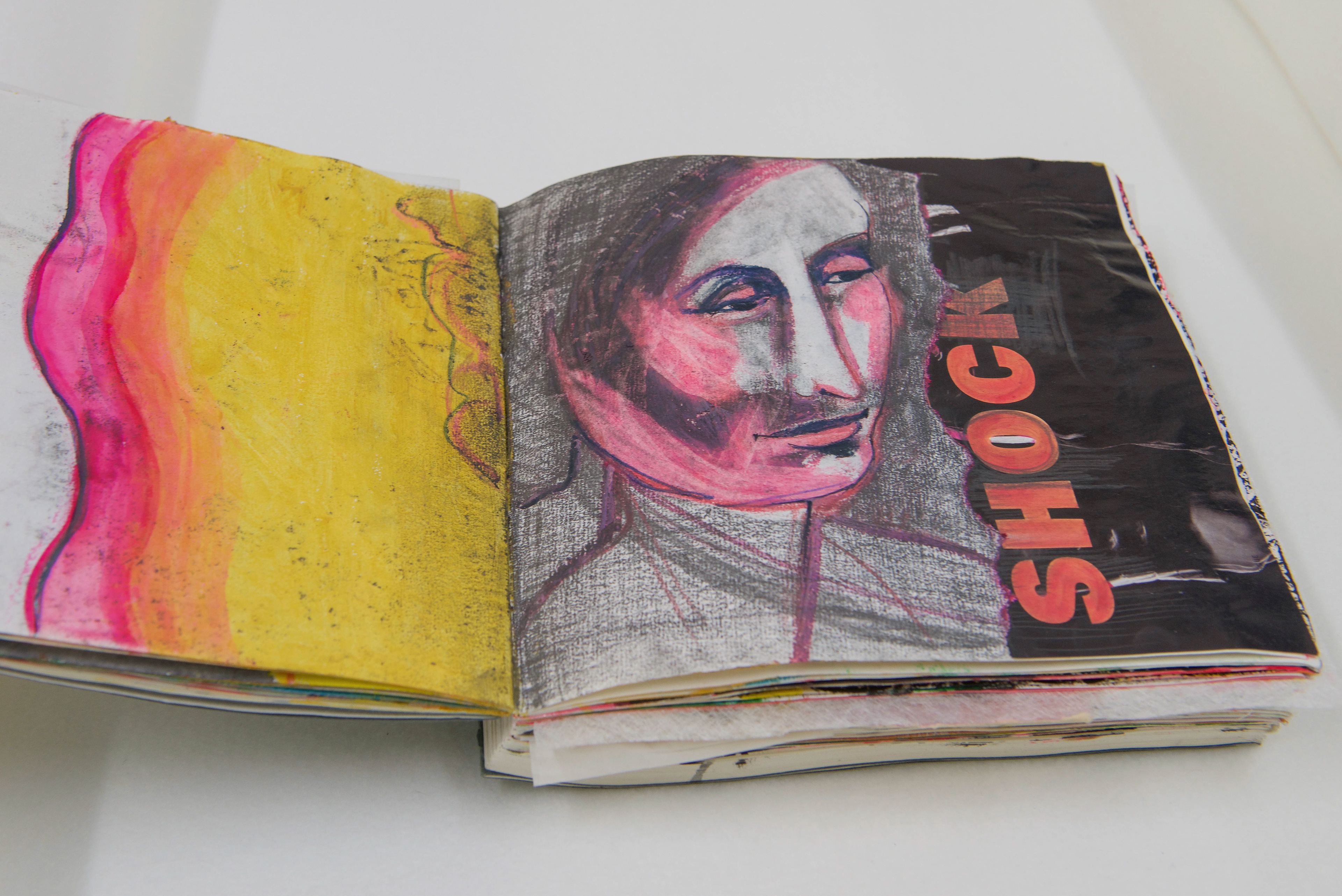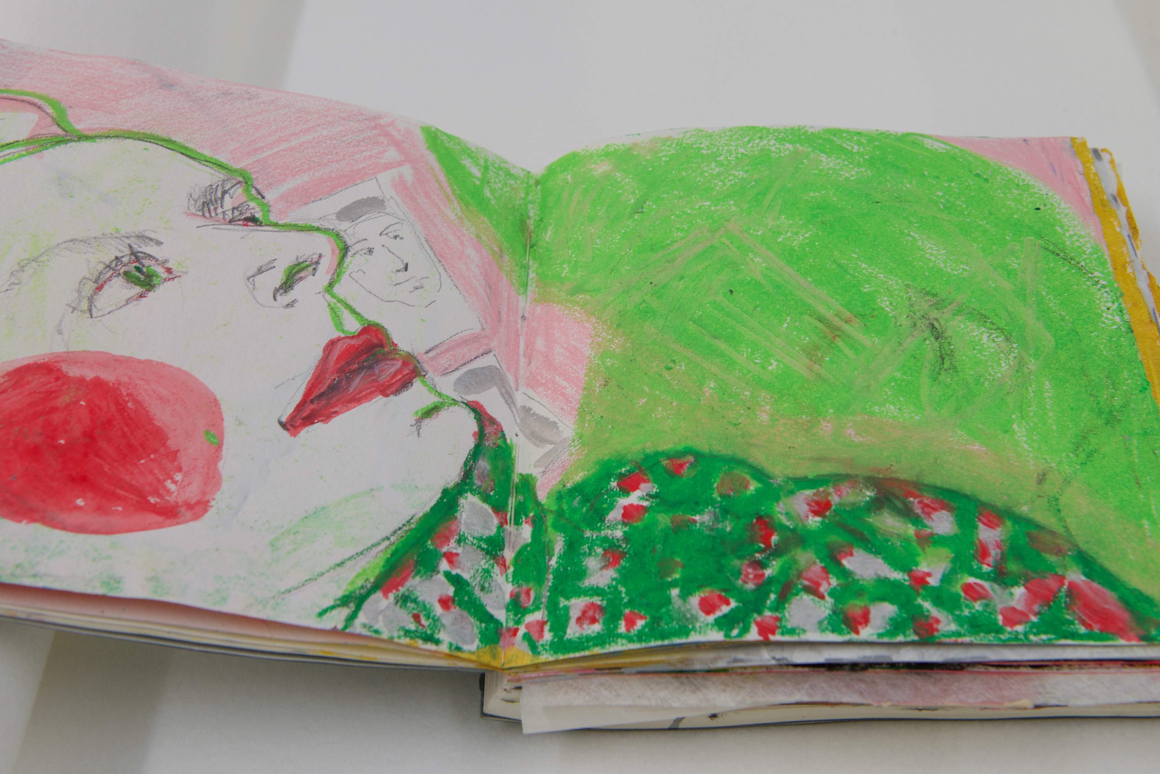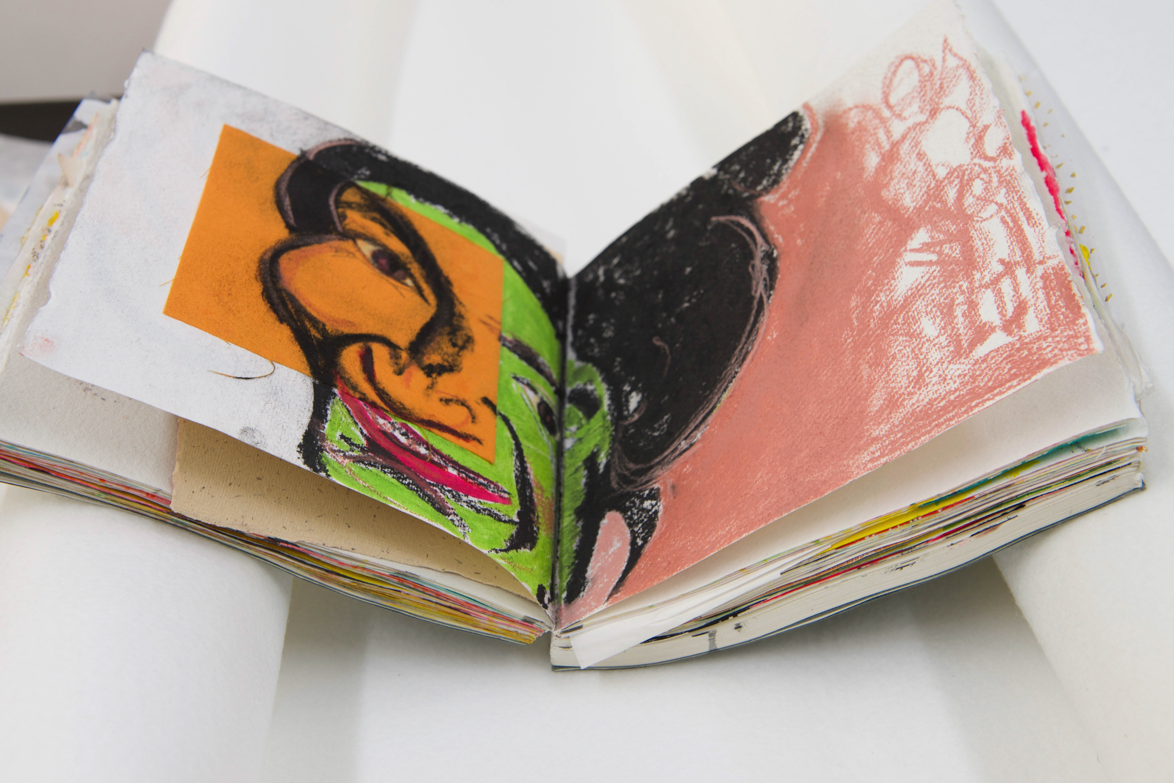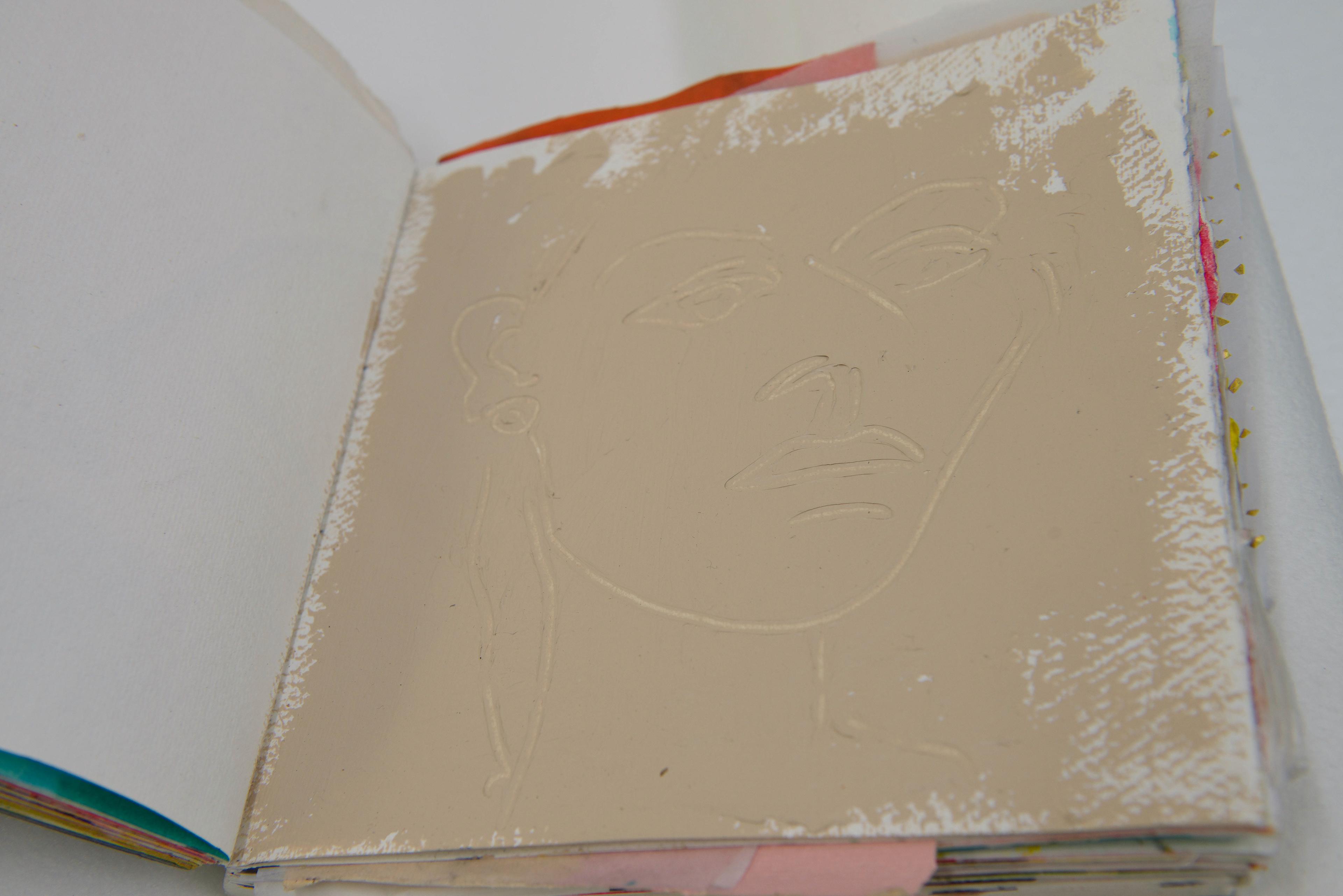 Face Book is an ephemeral, sketch-like form of a day-by-day diary with a register of everyday emotions. It contains 62 separate compositions, executed on paper, bound into a notebook/diary. In a way its form seems to be quite universal because it explores my interest in contemporary self-presentation techniques and tools that enable us to create and constant control our self-image, this diary is a collection of 'hand-made selfies'. Several images incorporate text in various languages: English, French, German or Polish. Face Book is very personal too, registering some uncomfortable facts about ageing for instance, facts that are embed into our lives by cultural pressures on women and men to stay perfect in terms of their looks, leaving us conscious about the way we present ourselves. Book's introverted content was inspired by an echo of European romanticism, especially poetry focused on inner feeling that was translated into more universal visual language. The diary form is not new of course, and I reminiscent one particular sketch diary that made a huge impression on my artistic approach, especially on the belief that we just have to create in whatever conditions and whether we can change our environment or not. This was a little diary I restored in the past, it was an anonymous object from Belsen-Belsen Camp museum, striking, crude images of camp everyday life in bold colours, using the form of sort of a comic, depicting humans with animals’ heads. Cruelty of this camp reality closed in a tiny pamphlet form, amazing quality of the drawings raised a question about inevitability of creative process… I've used mixed-media to implement techniques that are slightly incidental, are not leading to perfectly designed image. I feel that materials I've used are also feminine, intuitive: messy charcoal, oil stick, pencil, acrylics, salt printed image, lino, collage with printed material, textile, plastic etc. This collection of various material is coming from my belief that historically women were gathering the relics of the past, they were informal collectors of memories and I wanted to show that connection. Face Book was initially meant to be a very private record, and was not to be displayed, but during Artists’ Open Studios days in Hackney in 2017 it became a subject of a lot of interest from the visiting public and it was suggested that it should be published in form of an artistic book.