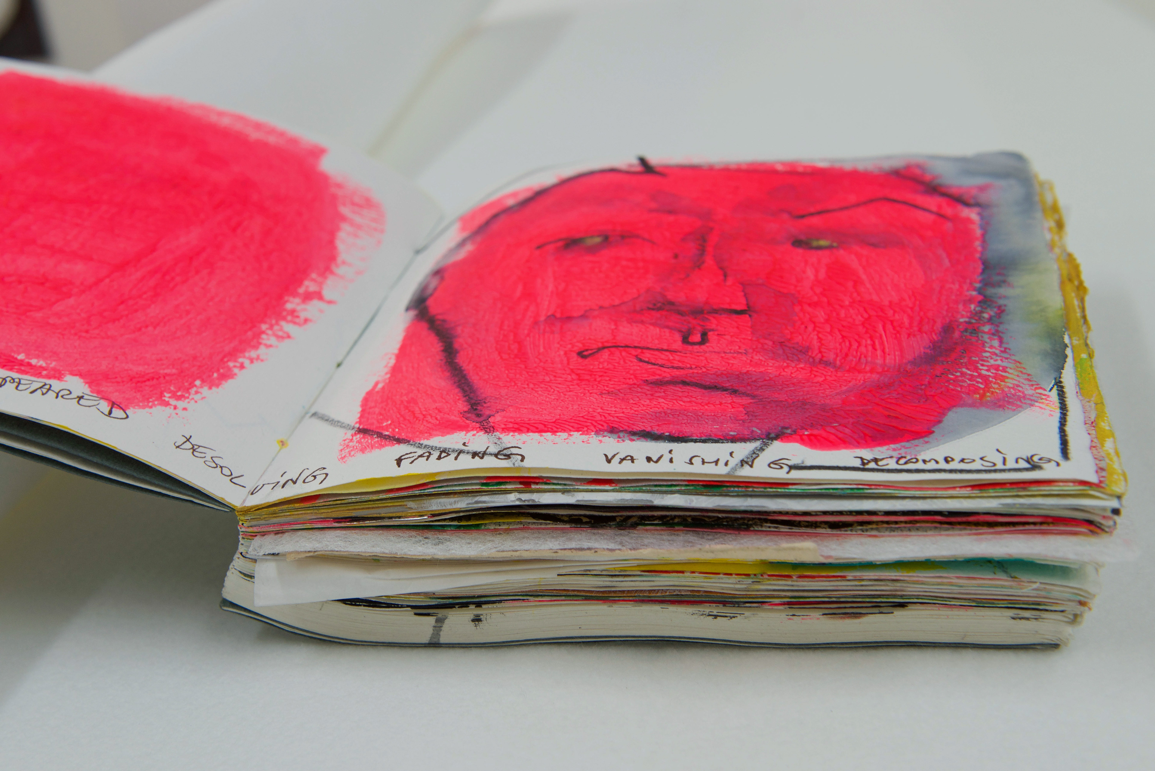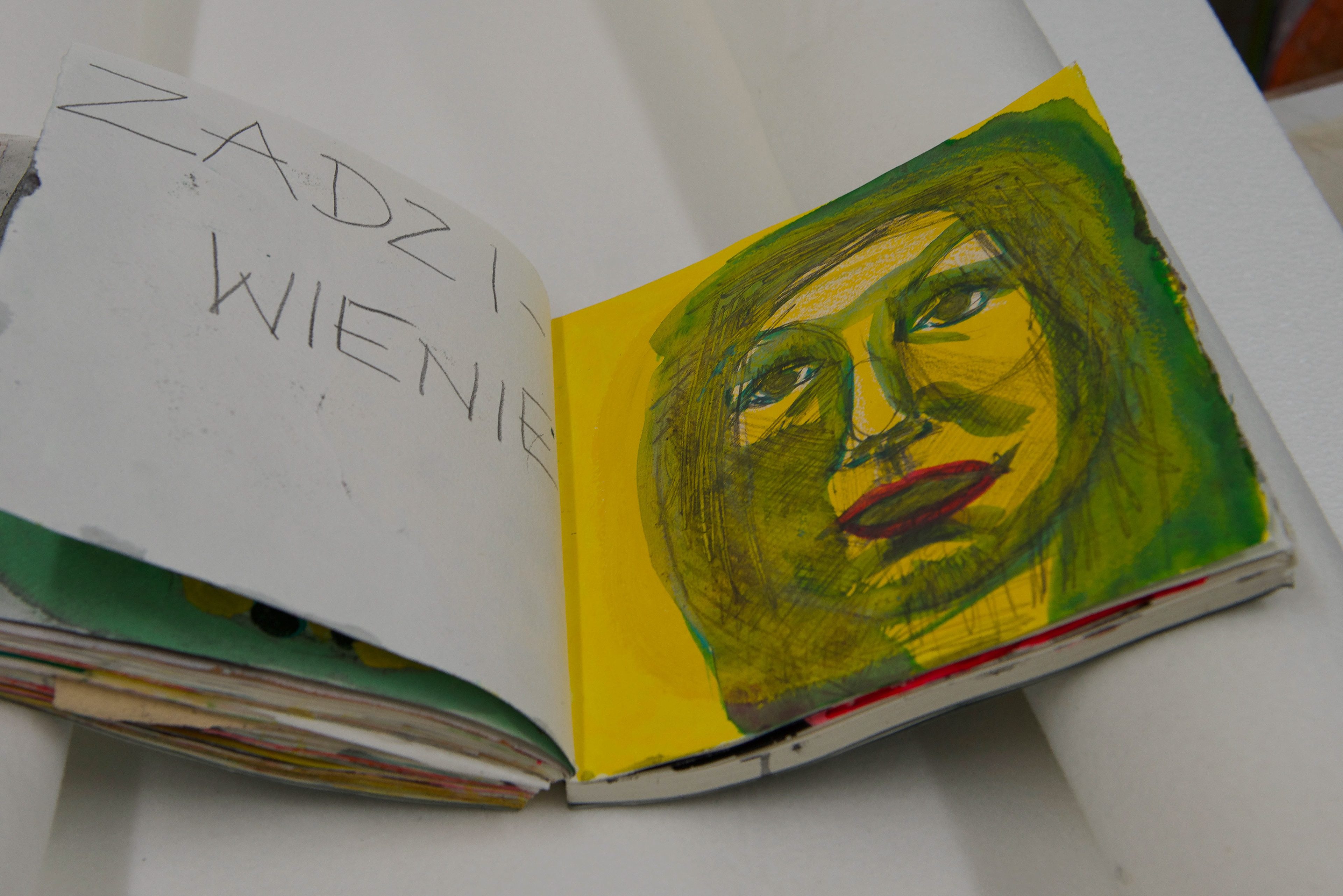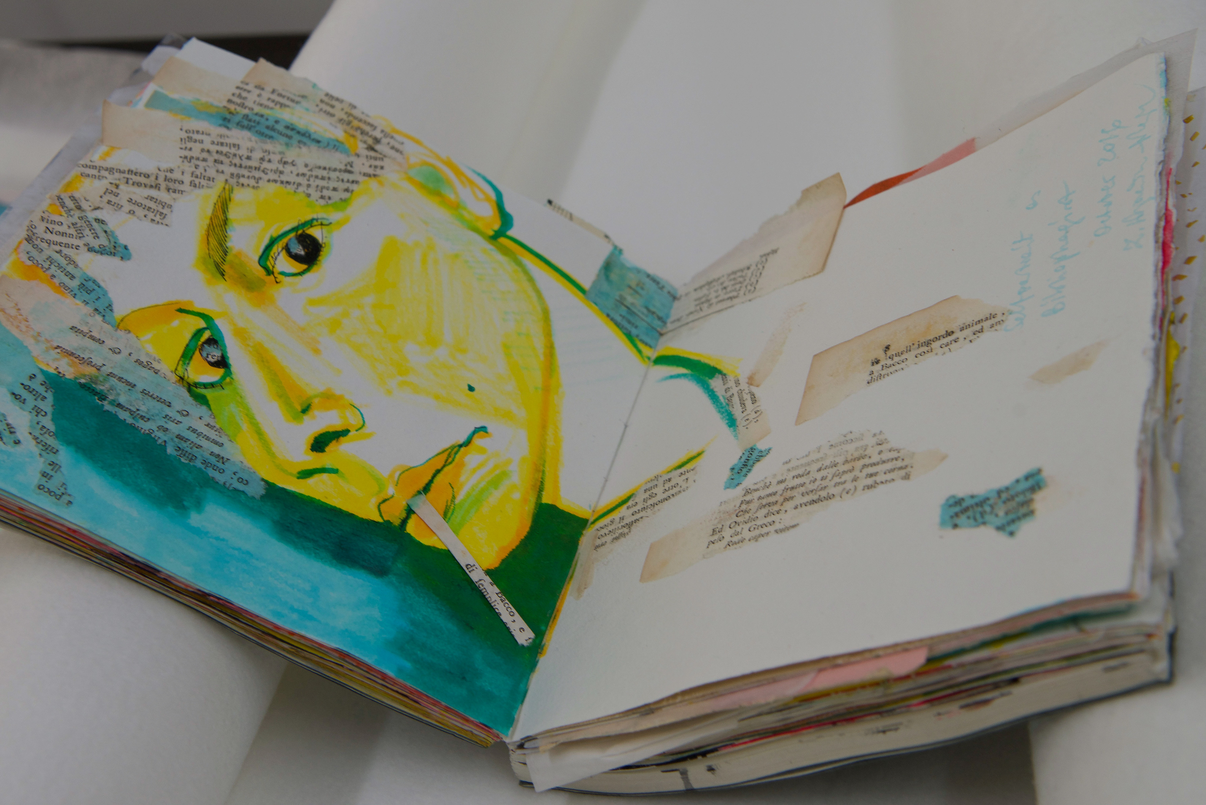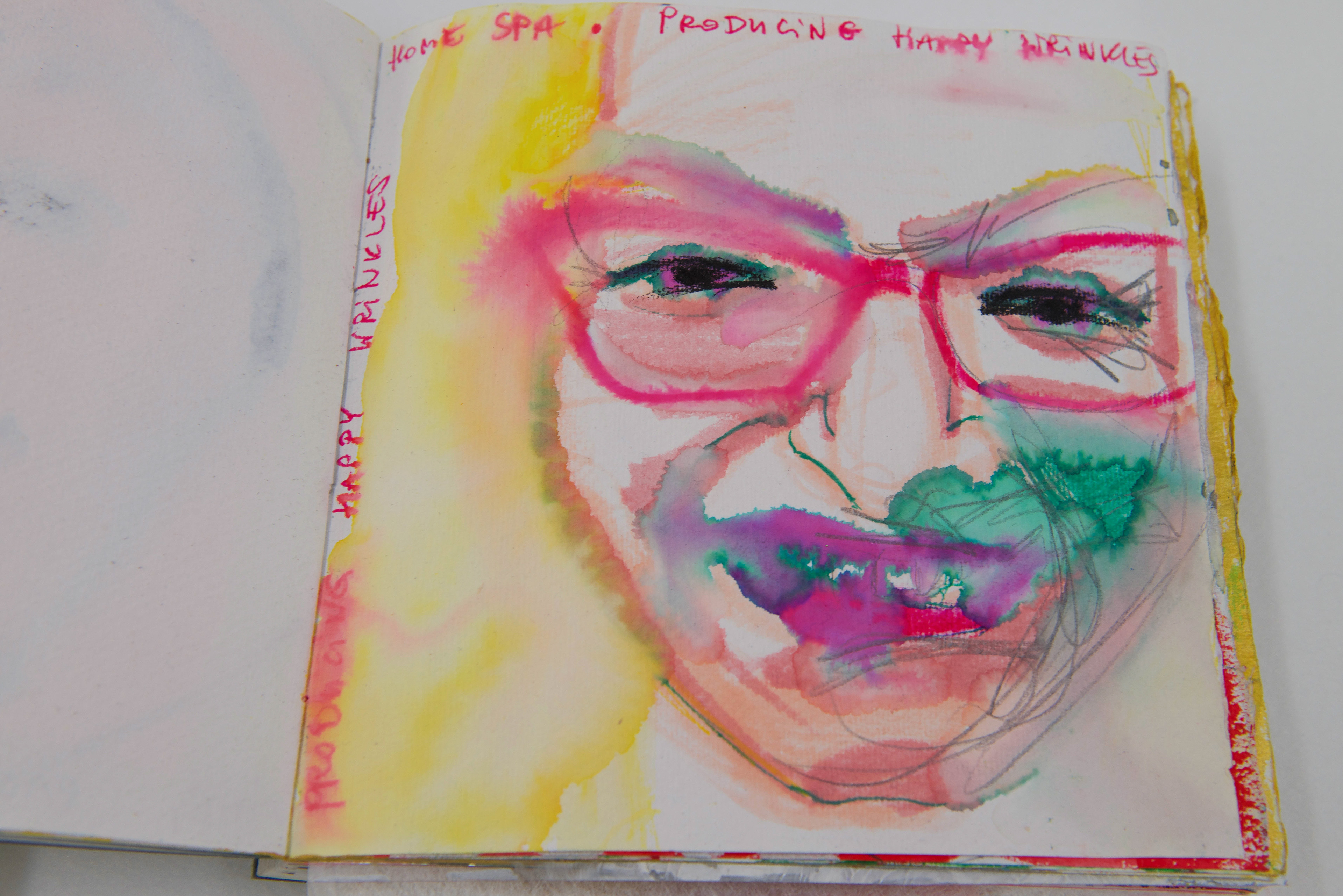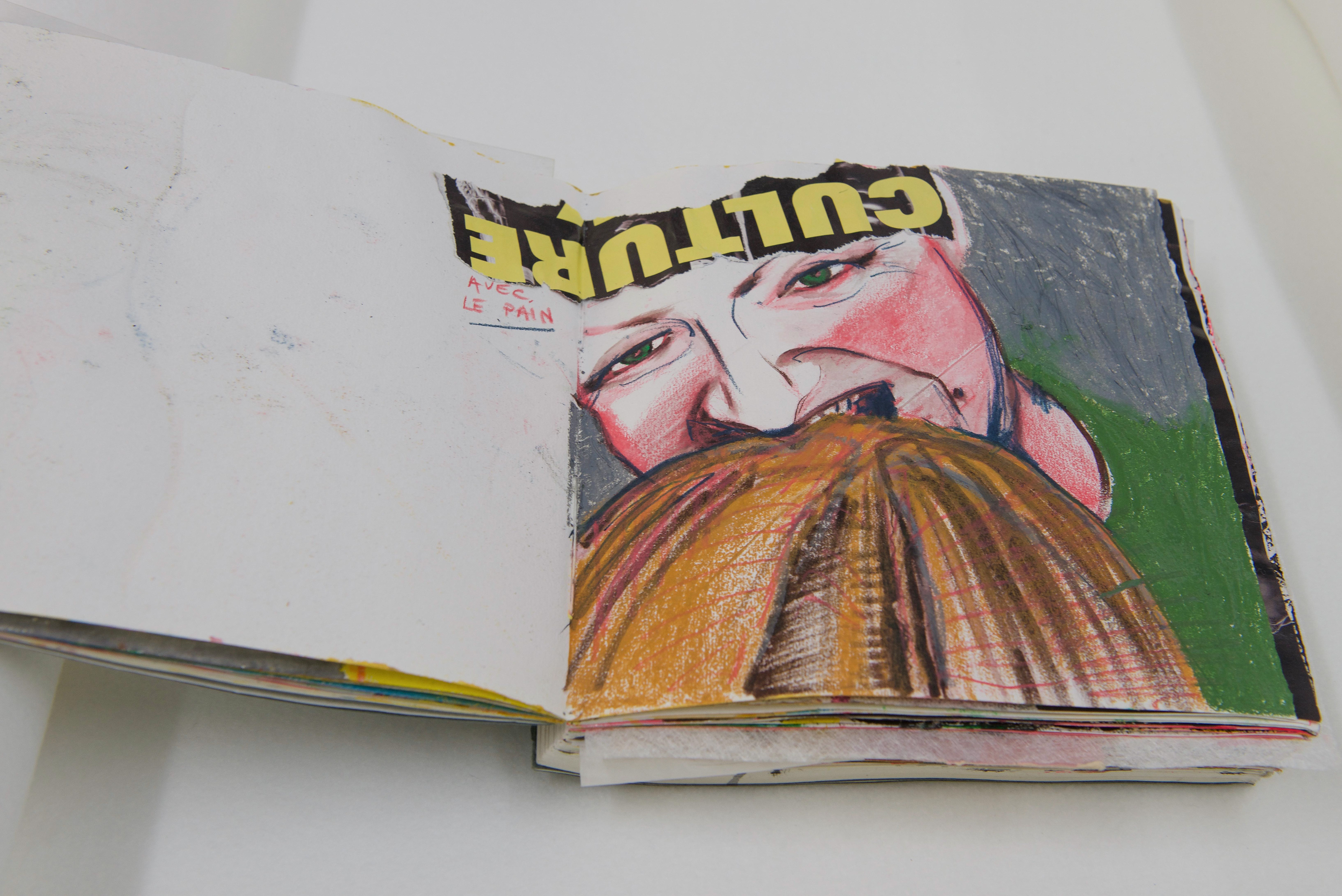 Face Book is an ephemeral, sketch-like form of a day-by-day diary with a register of everyday emotions. It contains 62 separate compositions, executed on paper, bound into a notebook/diary. In a way its form seems to be quite universal because it explores my interest in contemporary self-presentation techniques and tools that enable us to create and constant control our self-image, this diary is a collection of 'hand-made selfies'. Several images incorporate text in various languages: English, French, German or Polish. Face Book is very personal too, registering some uncomfortable facts about ageing for instance, facts that are embed into our lives by cultural pressures on women and men to stay perfect in terms of their looks, leaving us conscious about the way we present ourselves. Book's introverted content was inspired by an echo of European romanticism, especially poetry focused on inner feeling that was translated into more universal visual language. The diary form is not new of course, and I reminiscent one particular sketch diary that made a huge impression on my artistic approach, especially on the belief that we just have to create in whatever conditions and whether we can change our environment or not. This was a little diary I restored in the past, it was an anonymous object from Belsen-Belsen Camp museum, striking, crude images of camp everyday life in bold colours, using the form of sort of a comic, depicting humans with animals’ heads. Cruelty of this camp reality closed in a tiny pamphlet form, amazing quality of the drawings raised a question about inevitability of creative process… I've used mixed-media to implement techniques that are slightly incidental, are not leading to perfectly designed image. I feel that materials I've used are also feminine, intuitive: messy charcoal, oil stick, pencil, acrylics, salt printed image, lino, collage with printed material, textile, plastic etc. This collection of various material is coming from my belief that historically women were gathering the relics of the past, they were informal collectors of memories and I wanted to show that connection. Face Book was initially meant to be a very private record, and was not to be displayed, but during Artists’ Open Studios days in Hackney in 2017 it became a subject of a lot of interest from the visiting public and it was suggested that it should be published in form of an artistic book.