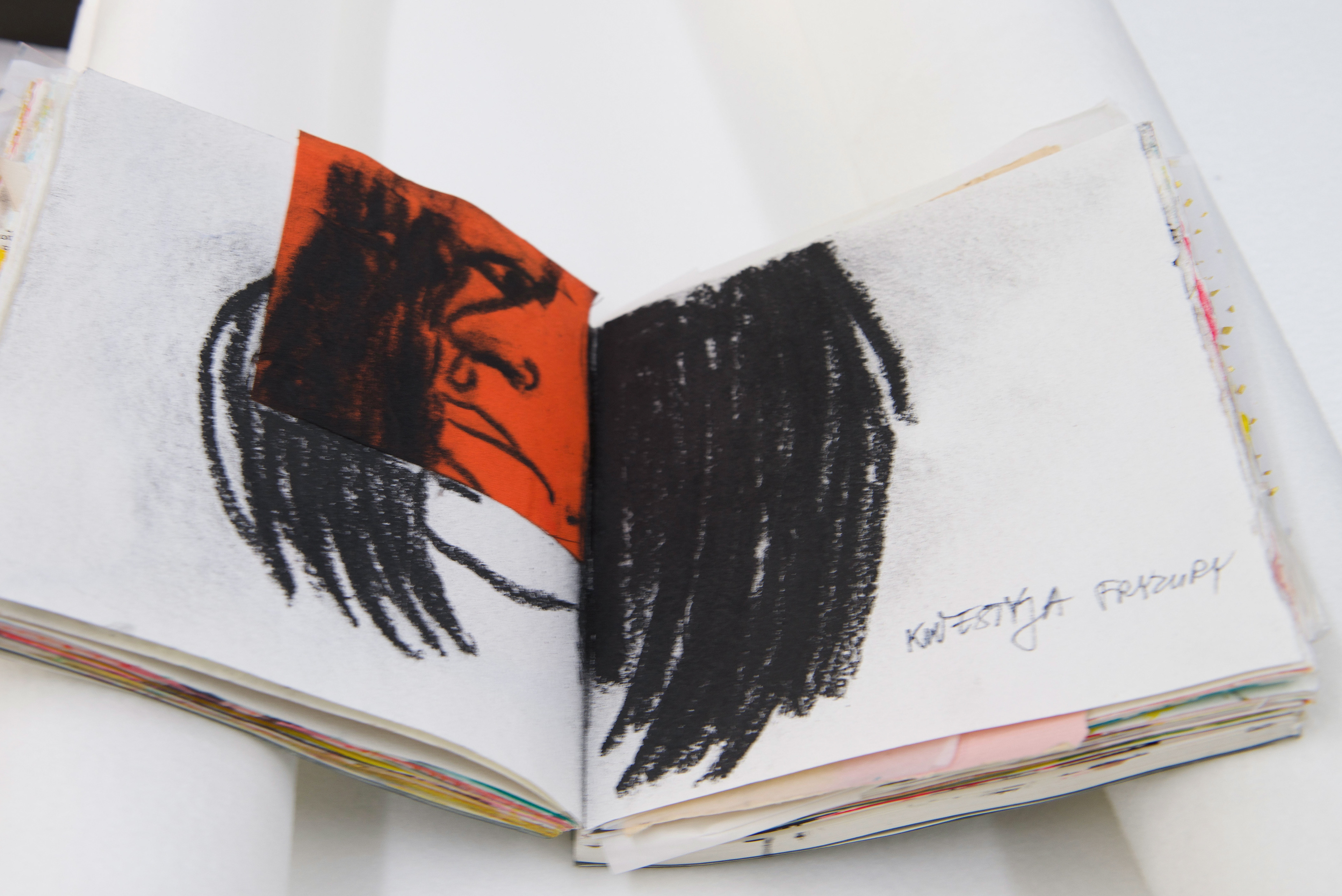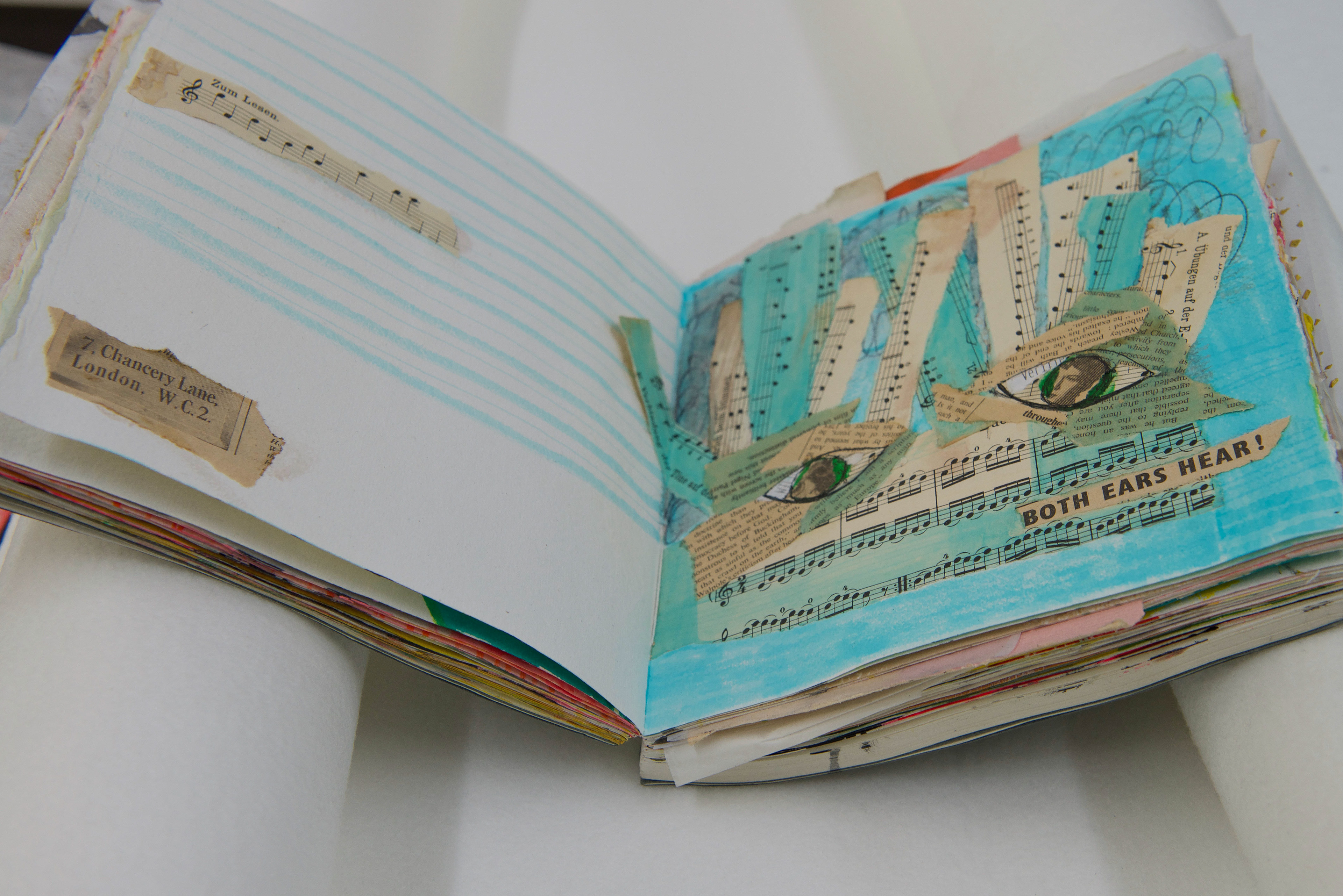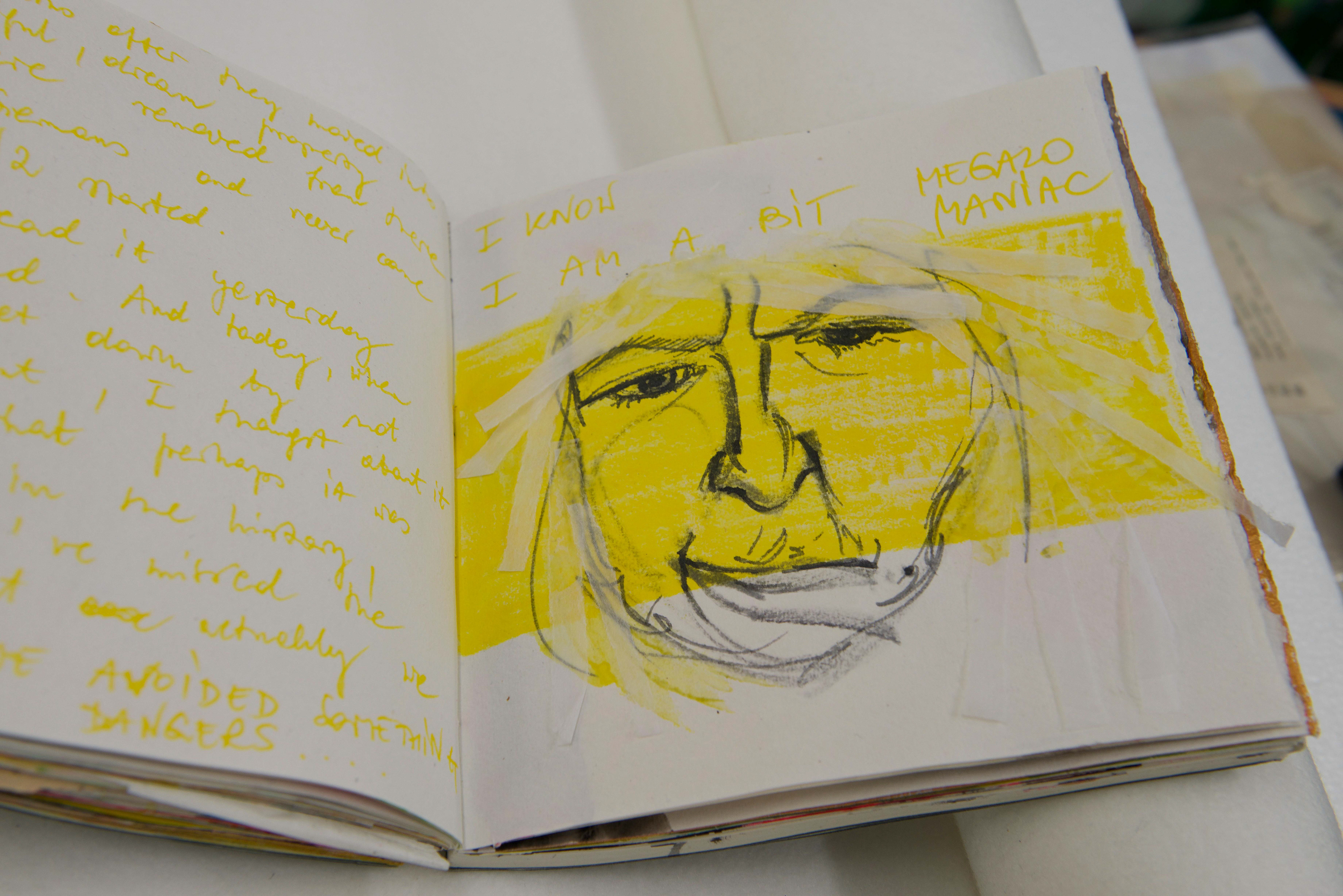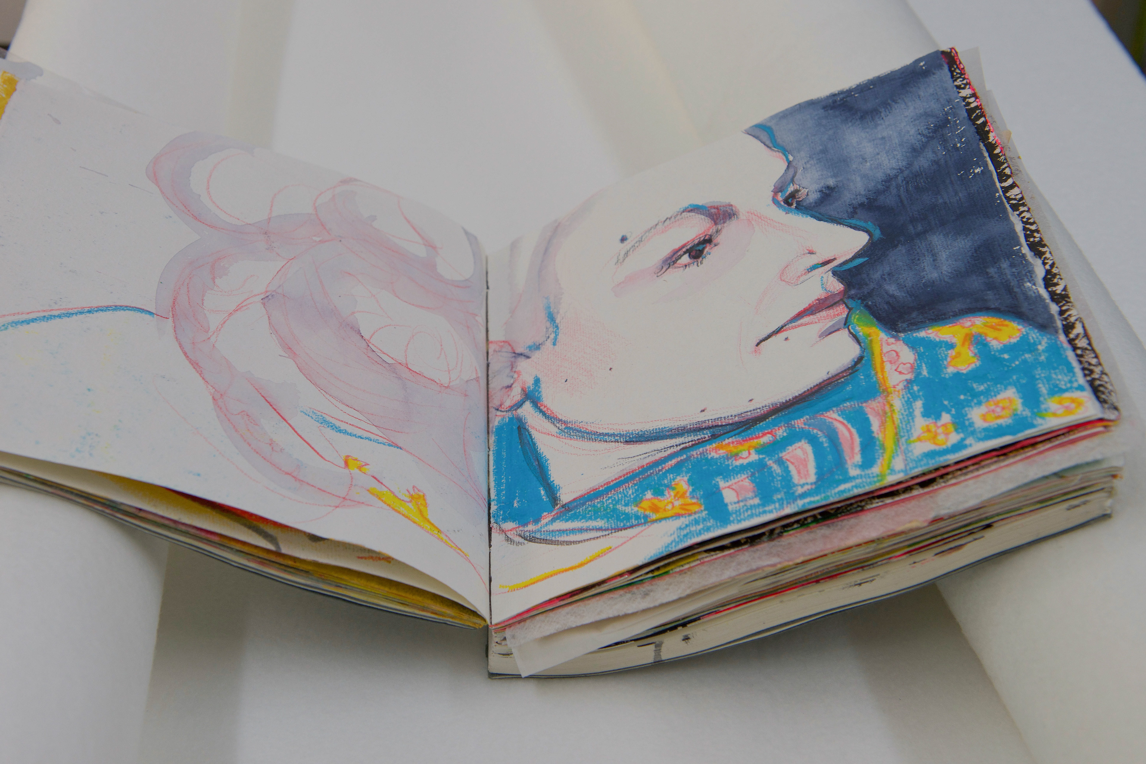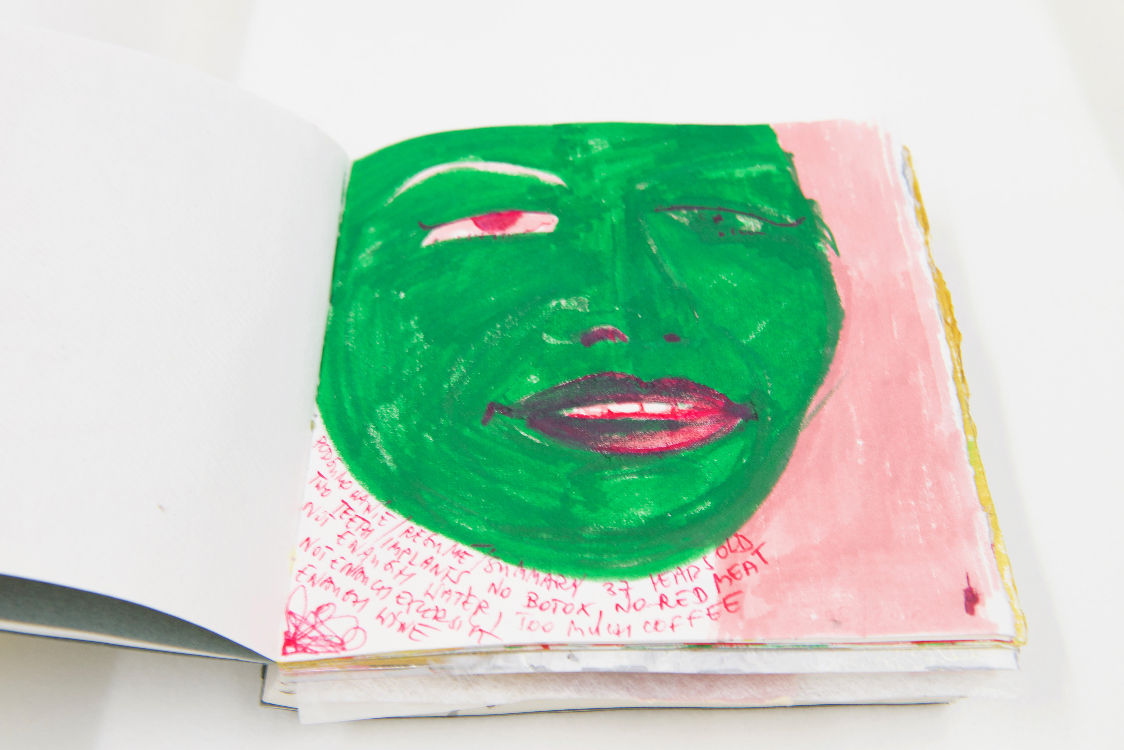 Face Book is an ephemeral, sketch-like form of a day-by-day diary with a register of everyday emotions. It contains 62 separate compositions, executed on paper, bound into a notebook/diary. In a way its form seems to be quite universal because it explores my interest in contemporary self-presentation techniques and tools that enable us to create and constant control our self-image, this diary is a collection of 'hand-made selfies'. Several images incorporate text in various languages: English, French, German or Polish. Face Book is very personal too, registering some uncomfortable facts about ageing for instance, facts that are embed into our lives by cultural pressures on women and men to stay perfect in terms of their looks, leaving us conscious about the way we present ourselves. Book's introverted content was inspired by an echo of European romanticism, especially poetry focused on inner feeling that was translated into more universal visual language. The diary form is not new of course, and I reminiscent one particular sketch diary that made a huge impression on my artistic approach, especially on the belief that we just have to create in whatever conditions and whether we can change our environment or not. This was a little diary I restored in the past, it was an anonymous object from Belsen-Belsen Camp museum, striking, crude images of camp everyday life in bold colours, using the form of sort of a comic, depicting humans with animals’ heads. Cruelty of this camp reality closed in a tiny pamphlet form, amazing quality of the drawings raised a question about inevitability of creative process… I've used mixed-media to implement techniques that are slightly incidental, are not leading to perfectly designed image. I feel that materials I've used are also feminine, intuitive: messy charcoal, oil stick, pencil, acrylics, salt printed image, lino, collage with printed material, textile, plastic etc. This collection of various material is coming from my belief that historically women were gathering the relics of the past, they were informal collectors of memories and I wanted to show that connection. Face Book was initially meant to be a very private record, and was not to be displayed, but during Artists’ Open Studios days in Hackney in 2017 it became a subject of a lot of interest from the visiting public and it was suggested that it should be published in form of an artistic book.